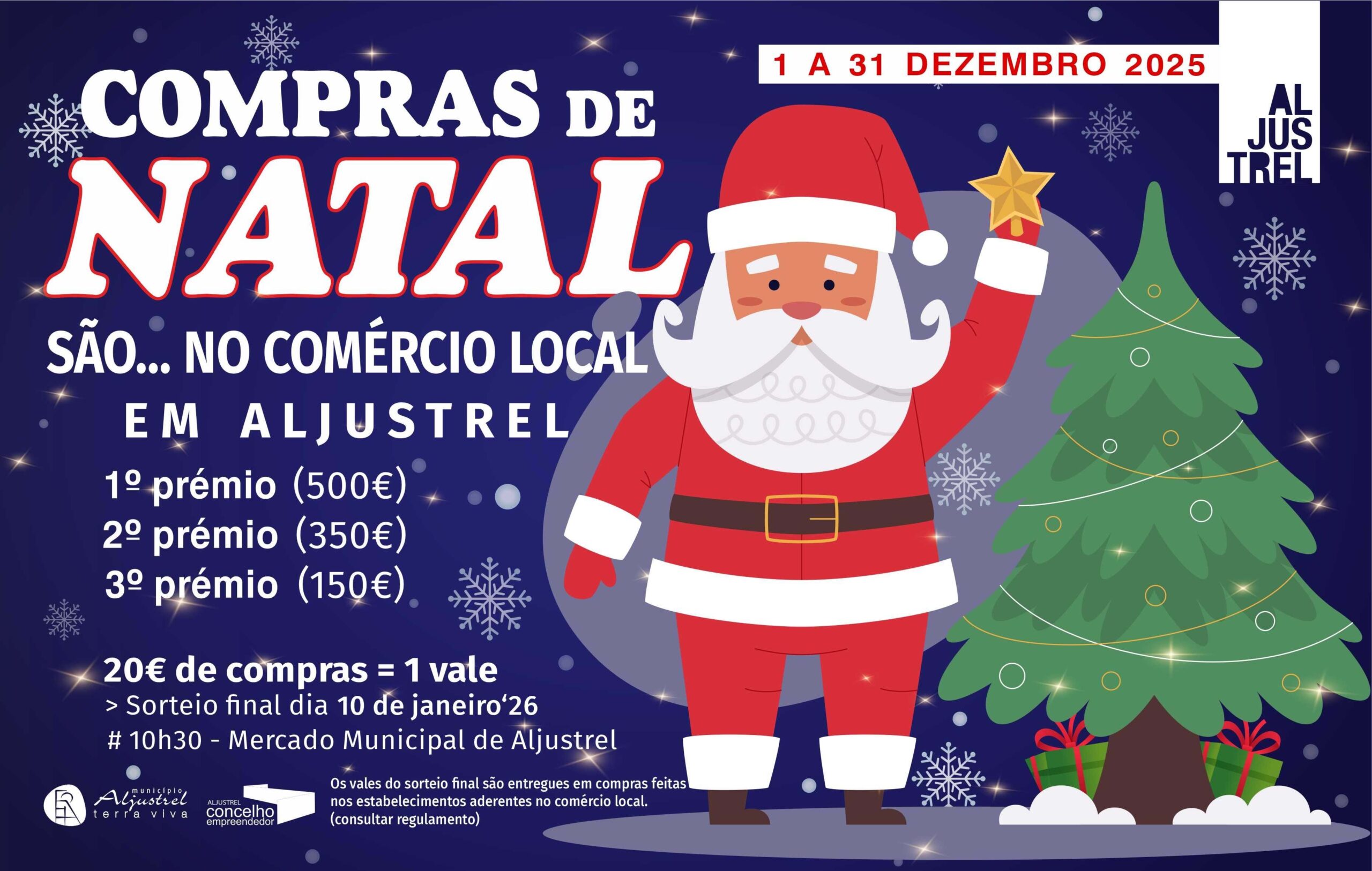Compre no comércio local 20€ de compras = 1 vale Os vales dos sorteios são entregues em compras feitas nos estabelecimentos aderentes no comércio local. Prémios:1º prémio (500€)2º prémio (350€)3º prémio (150€) > Sorteio final dia 10 de janeiro‘26, 10h30 no...