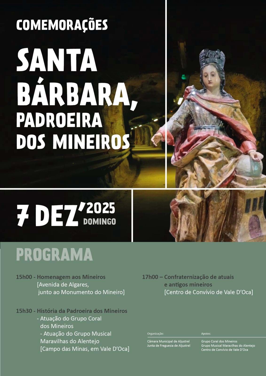 A Câmara Municipal de Aljustrel vai comemorar, a 4 de dezembro, o Dia de Santa Bárbara, padroeira dos mineiros, e, no mesmo dia, assinalar o 2.º ano de atividade do Parque Mineiro de Aljustrel. Conferências, uma exposição e uma visita aberta a esta...