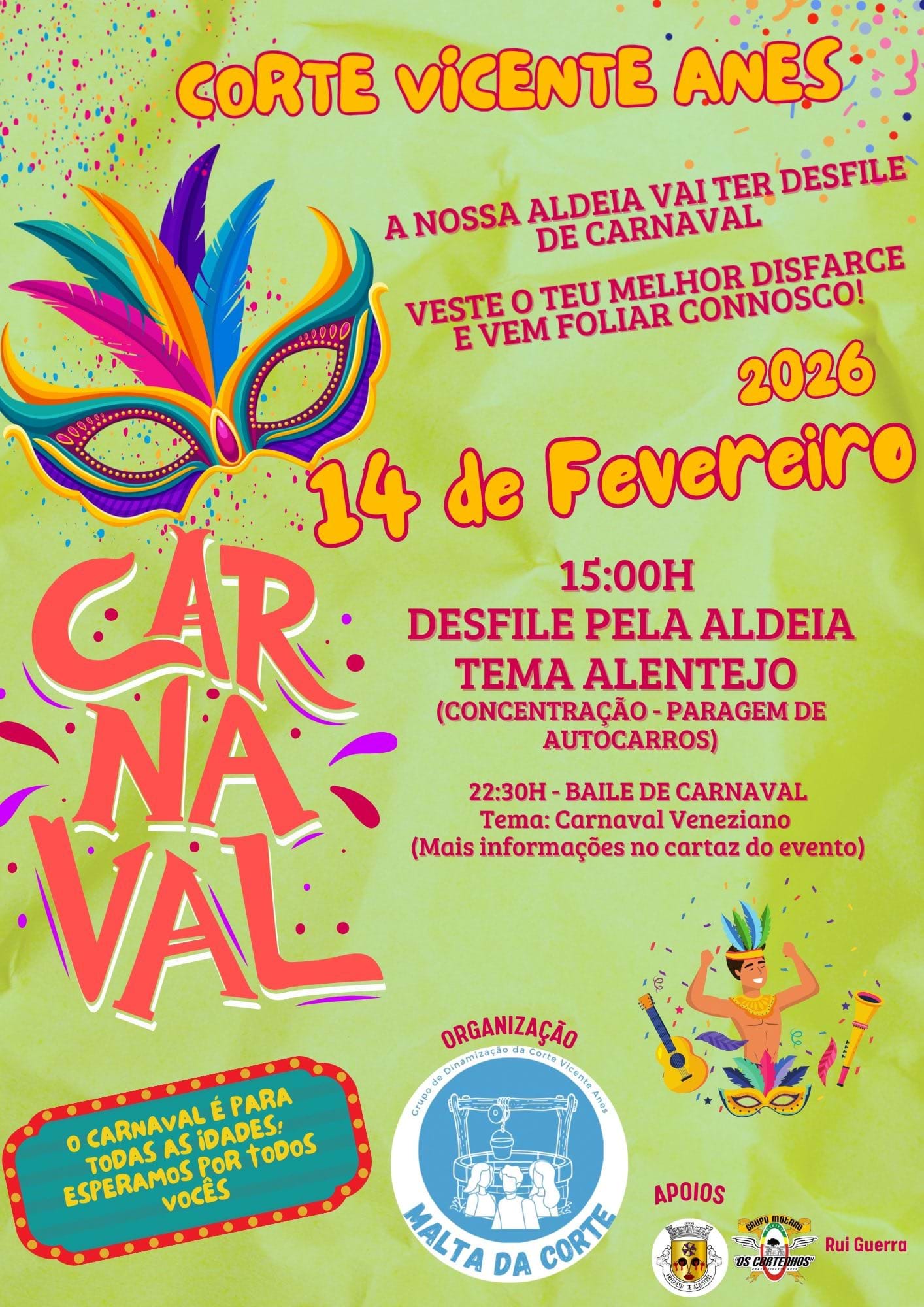 15h00 – Desfile de Carnaval Tema: Alentejo (Concentração: paragem de autocarro) 22h30 – Baile de Máscaras Tema: ‘‘Carnaval Veneziano’’ com KJ Nuno e prémios para melhores máscaras. (Junto ao Grupo Motard)...