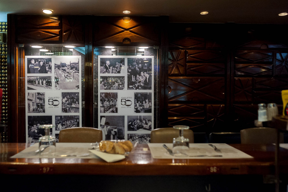 Um motivo forte para ir ao Galeto, se de tal se precisar, é o incrível balcão corrido onde nos sentamos lado a lado e encaramos outro cliente, uma disposição que o torna único na cidade. Aliado a isso, será a completa carta de comida tradicional e as generosas horas em que está aberto, alimentando os noitibós de Lisboa quando mais ninguém lhes dá guarida. Desde as 7 da manhã, acompanha os lisboetas nos seus diferentes apetites: o pequeno-almoço, a refeição, um combinado, um hambúrguer em pão de brioche ou um copo. Menos conhecida é a sala de refeições no piso inferior, que também merece a visita. Foi inaugurado em 1967, sendo considerado à época um templo de modernidade. Mantém-se igual a si próprio, com os característicos balcões corridos, serviço rápido e eficiente, e uma ementa onde há sempre uma sugestão que vem mesmo a calhar, dos bifes aos combinados, das tostas às sopas.